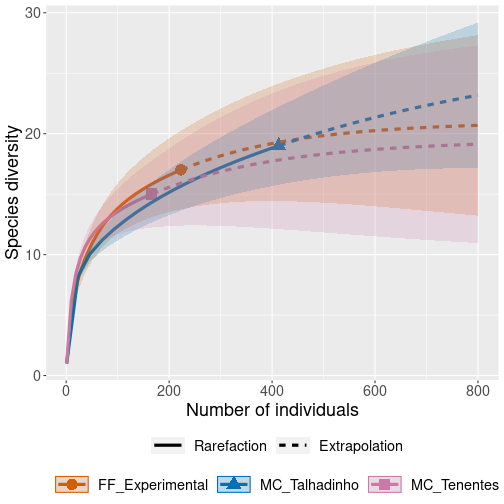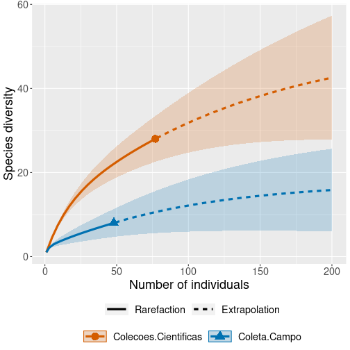 library(iNEXT)library(devtools)#devtools::install_github("paternogbc/ecodados")library(ecodados)dados_rarefacao <- rarefacao_morcegosresultados_morcegos <- iNEXT(dados_rarefacao, q = 0, datatype = "abundance", endpoint = 800)# q refere-se a família *Hill-numbers* (Hill 1973) onde 0 = riqueza de espécies, 1 = diversidade de Shannon, e 2 = diversidade de Simpson.# Veja mais detalhes sobre os números de Hill no Capítulo 7 onde tratamos de extrapolações.# datatype refere-se ao tipo de dados que você vai analisar (e.g. abudância, incidência).# endpoint refere-se ao valor de referência que você determina para a extrapolação.ggiNEXT(resultados_morcegos, type = 1)