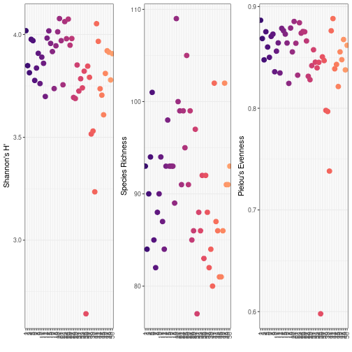 data(BCI)data("BCI.env")# ShannonH <- diversity(BCI)# Riquezarichness <- specnumber(BCI) # Equitatividade de Pielouevenness <- H/log(richness)# Create alpha diversity dataframe including environmental dataalpha <- cbind(shannon = H, richness = richness, pielou = evenness, BCI.env)alpha$site<-as.factor(seq(1:50))head(alpha)## shannon richness pielou UTM.EW UTM.NS elevation convex slope## 1 4.018412 93 0.8865579 625754 1011569 130.2525 -7.8725 6.694828## 2 3.848471 84 0.8685692 625754 1011669 136.8100 -10.7000 5.086842## 3 3.814060 90 0.8476046 625754 1011769 143.6775 -14.6675 3.104794## 4 3.976563 94 0.8752597 625754 1011869 147.0075 -16.7575 1.872813## 5 3.969940 101 0.8602030 625754 1011969 144.3850 -12.4850 5.118725## 6 3.776575 85 0.8500724 625854 1011569 136.8750 -9.6850 2.945532## aspectEW aspectNS site## 1 -0.89108252 -0.4538413 1## 2 -0.21903766 -0.9757164 2## 3 0.03051372 -0.9995343 3## 4 -0.86414183 -0.5032483 4## 5 -0.67148116 0.7410216 5## 6 -0.86532324 -0.5012142 6panel-name[Plots]